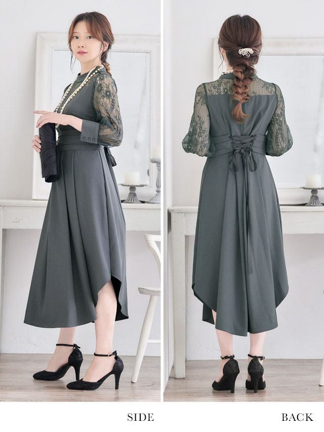 5. バックレースアップデザインアシンメトリーAライン膝下レーススリーブ結婚式パーティードレス [Retica/レティカ]