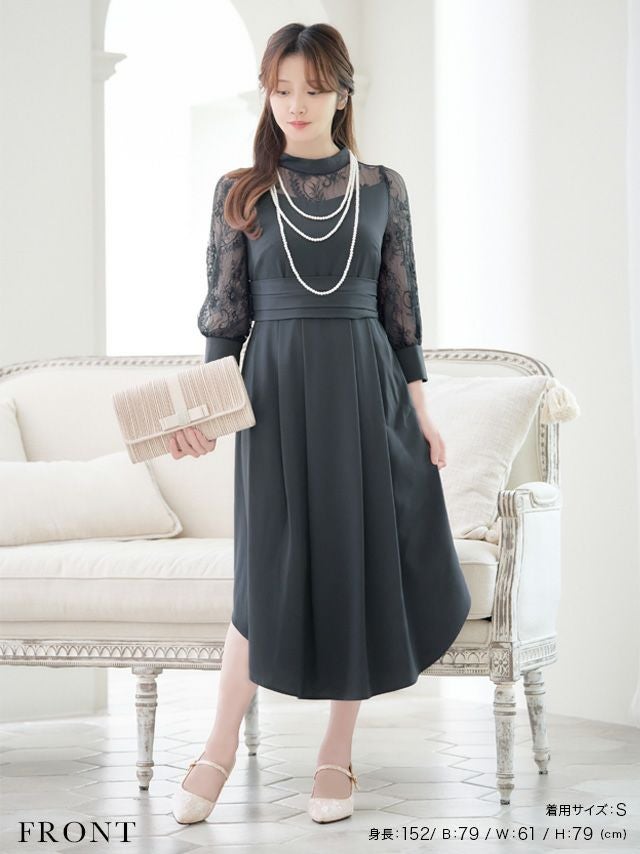 4. バックレースアップデザインアシンメトリーAライン膝下レーススリーブ結婚式パーティードレス [Retica/レティカ]