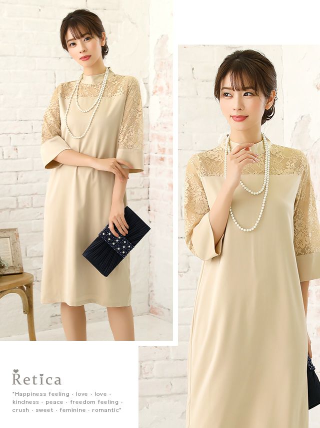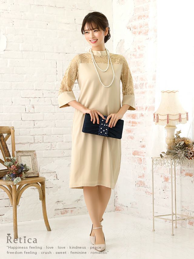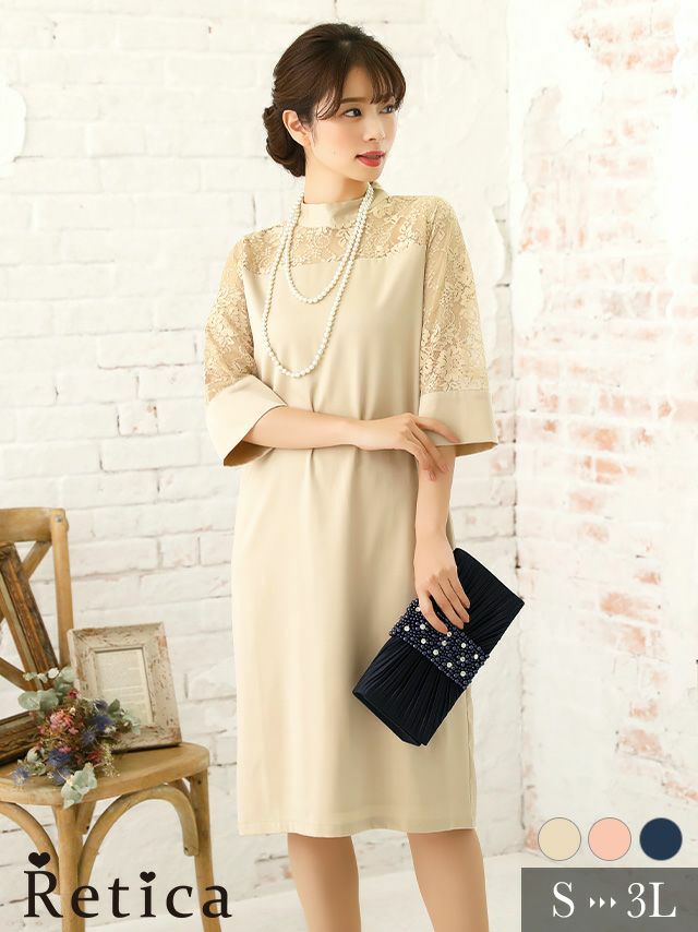 3. ハイネック七分袖サテンデザイン膝下結婚式パーティードレス [Retica/レティカ]