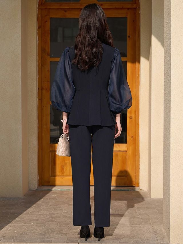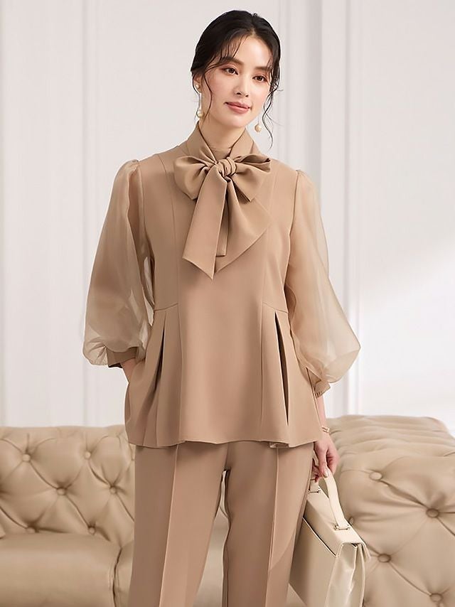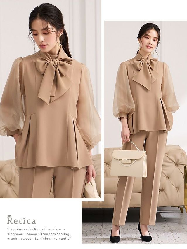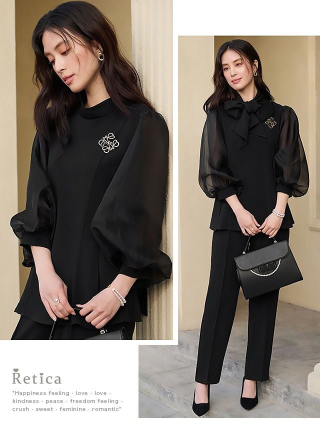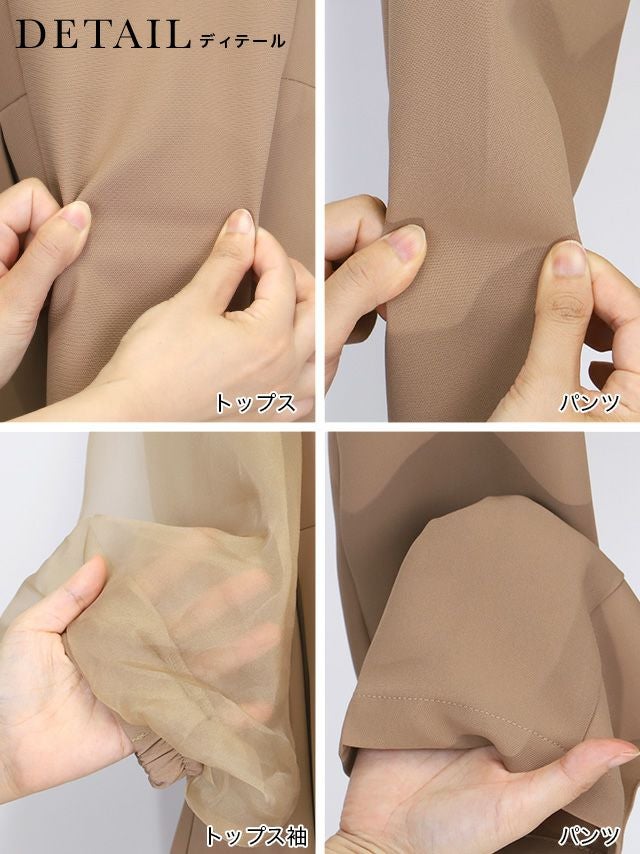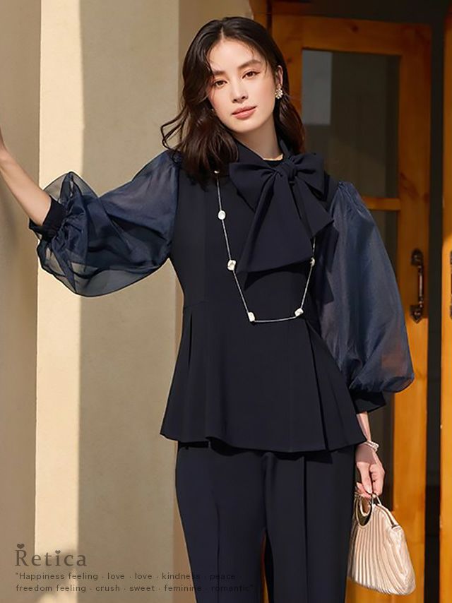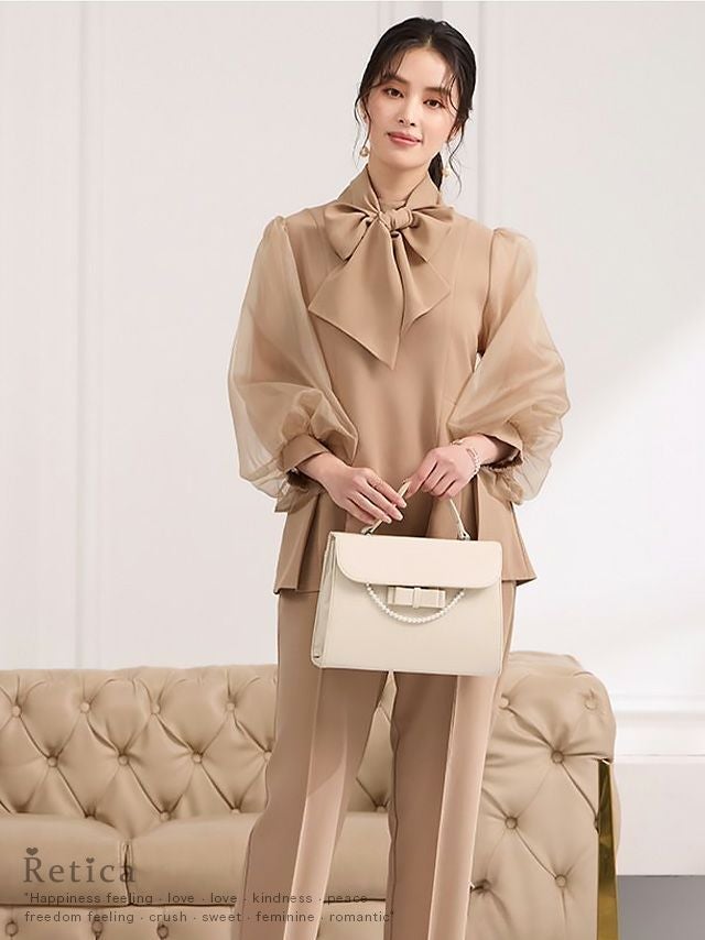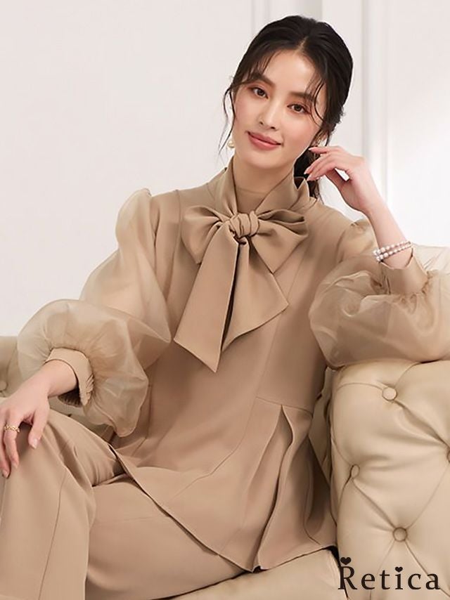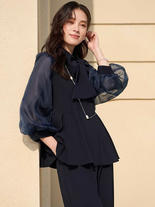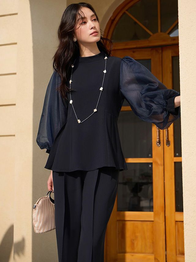 透け感のあるパフスリーブのブラウスと