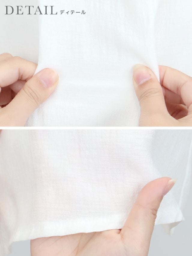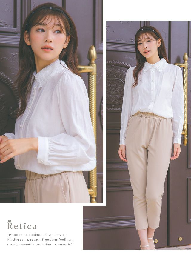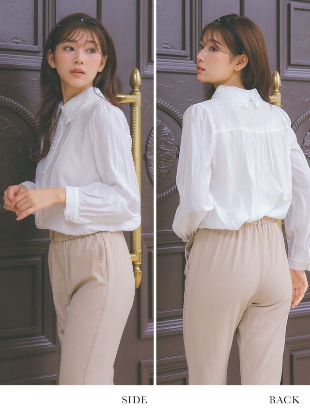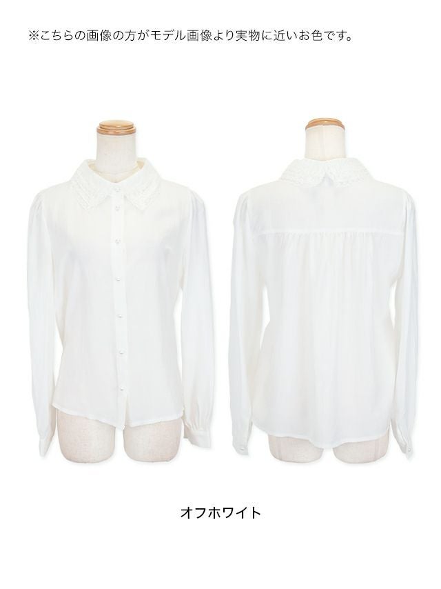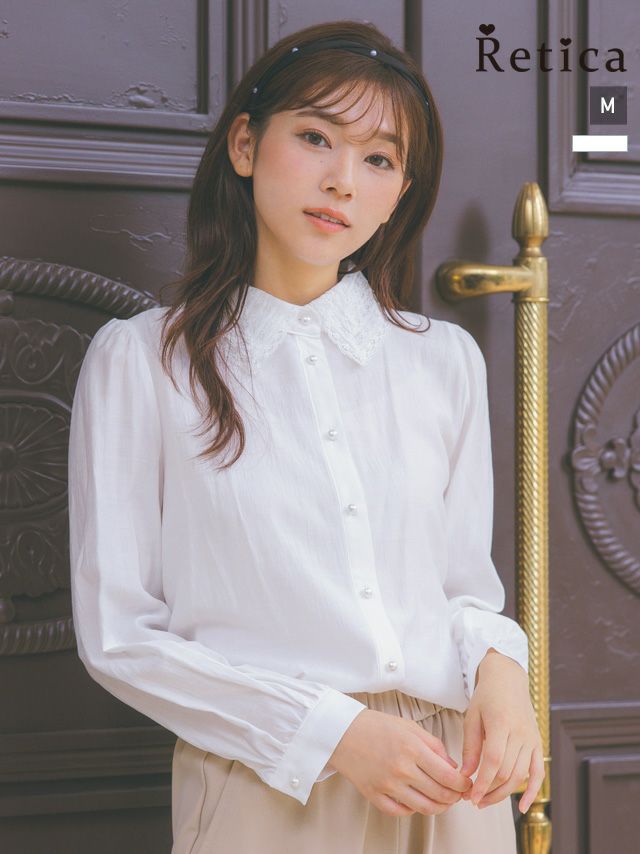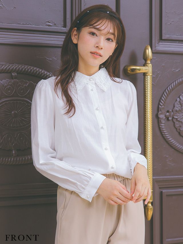 刺繍レースの襟元と、パールボタンで上品さを演出♪