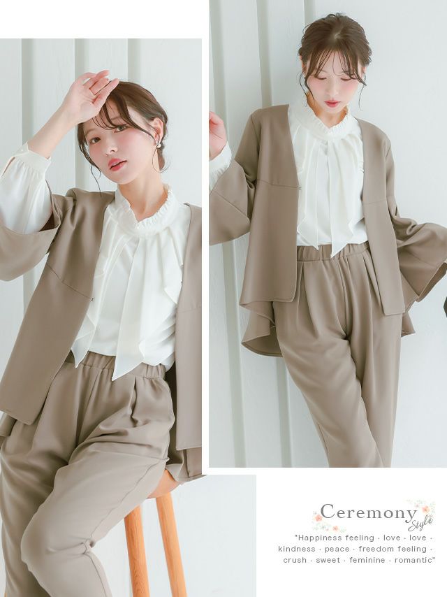 他の画像を見る 大人のこなれ感を演出♪ フレアスリーブノーカラージャケット×テーパードパンツスタイルセットアップセレモニースーツ [Retica/レティカ] ¥ 8,250 税込 詳細を見る お気に入りに追加