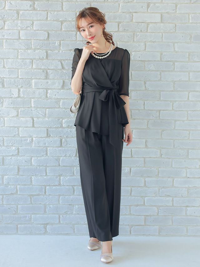 ウエストリボンでスタイルUP効果抜群♪ [SALE] ビスチェ風シースルー袖パンツセットパップパーティードレス (Sサイズ~3Lサイズ)