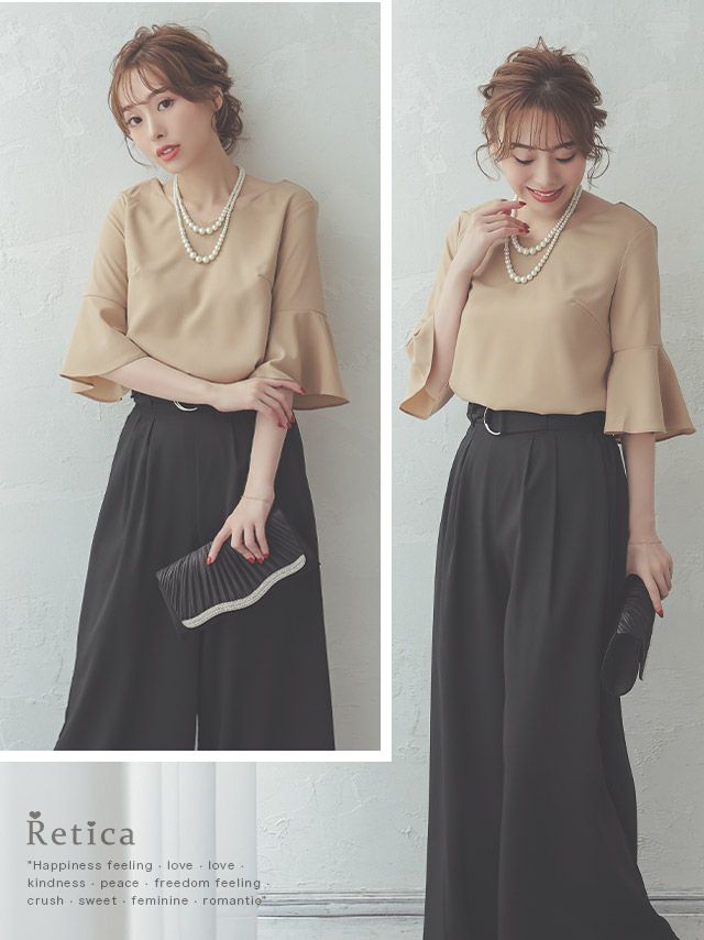4. [ゲリラセール] シンプル五分袖リングベルト付きタックワイドパンツツーピースベルスリーブ結婚式パーティードレス [Retica/レティカ]