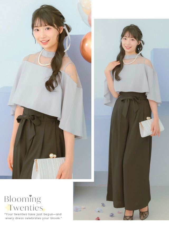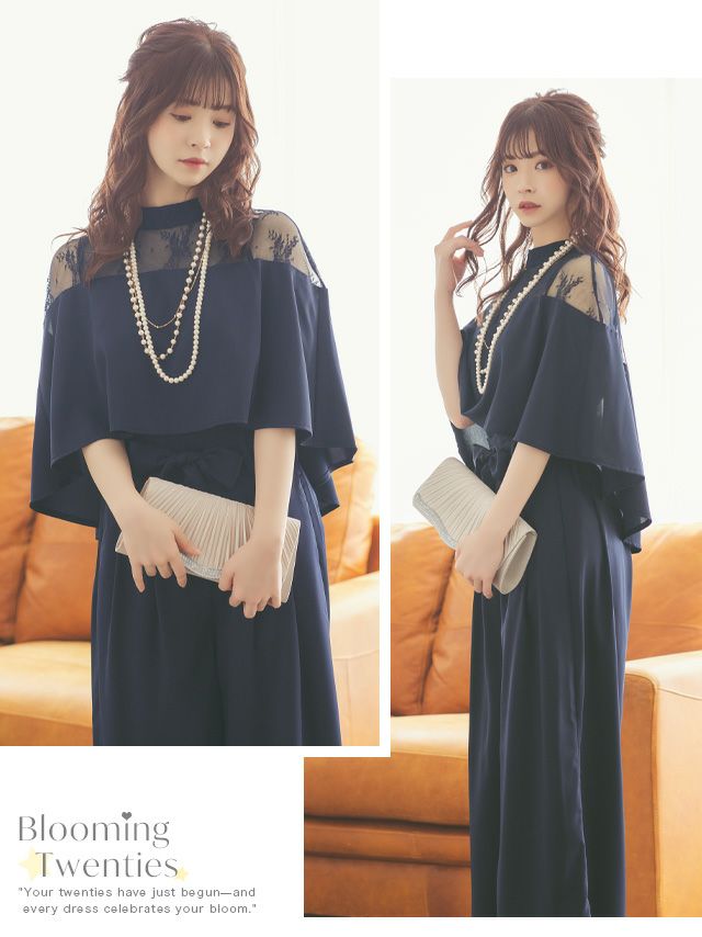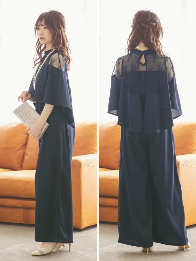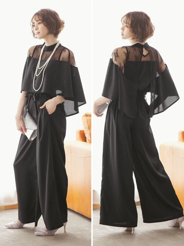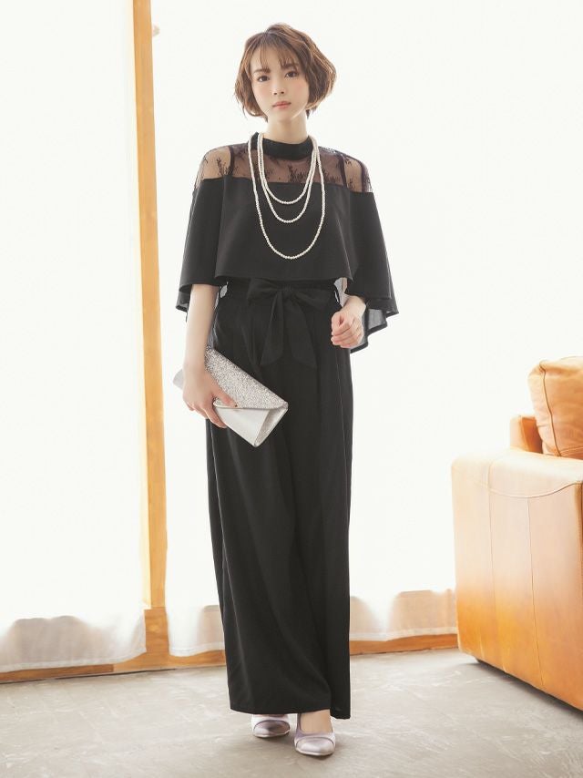 ケープを重ねたようなデザインが印象的なパンツドレス