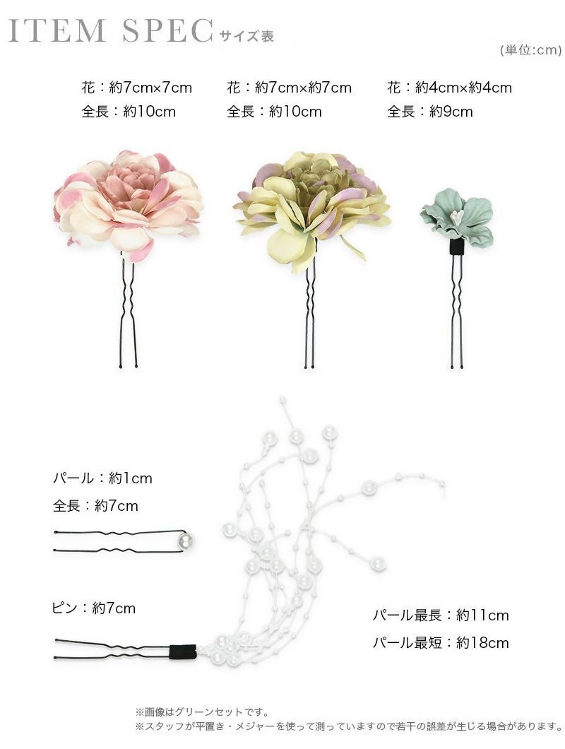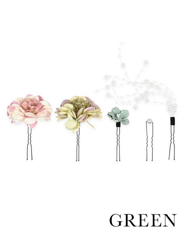 5. 垂れパール×フラワーヘアアクセサリー5点セット袴・振袖・浴衣対応(グリーン/ワインレッド)