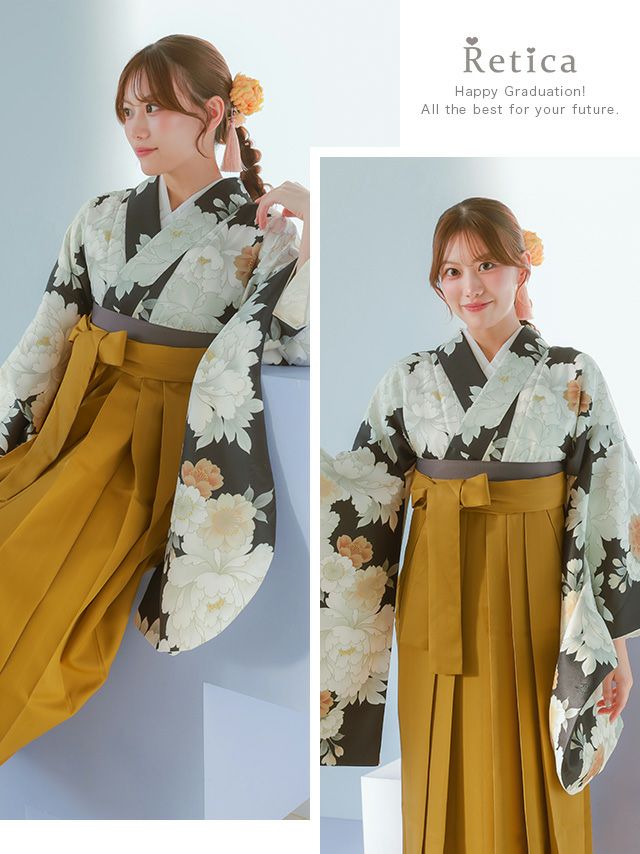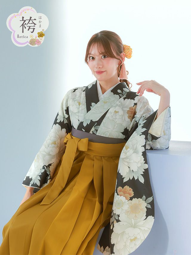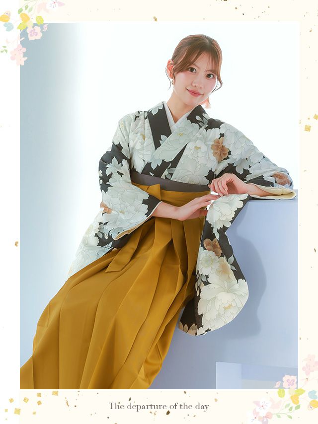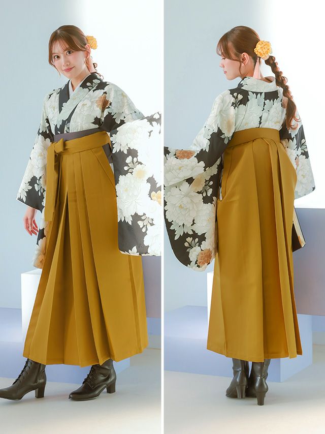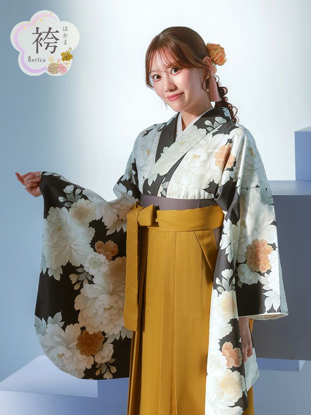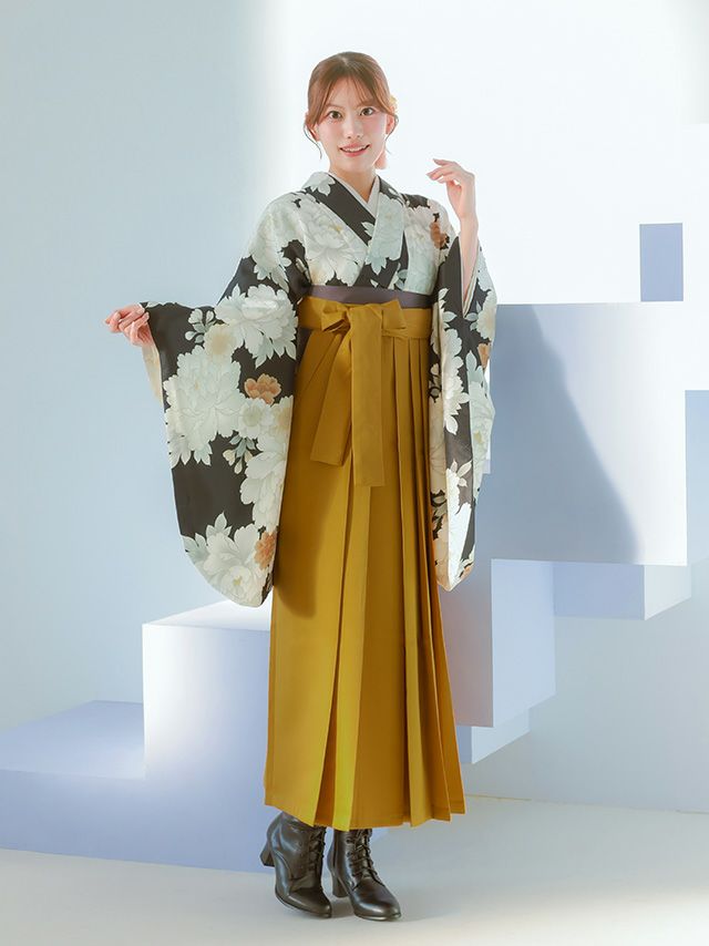 シックなブラックベースに優しい色合いの花柄をあしらった袴セット