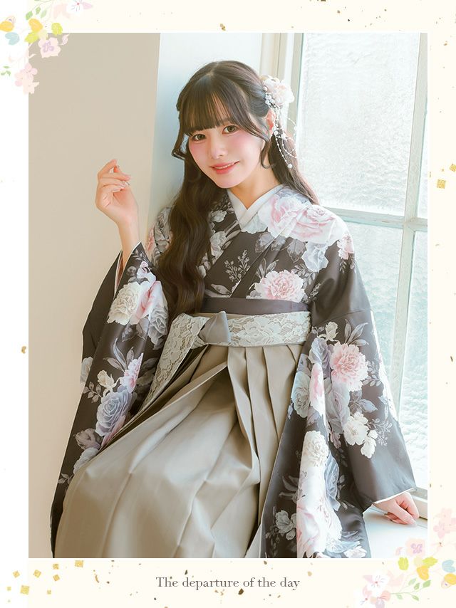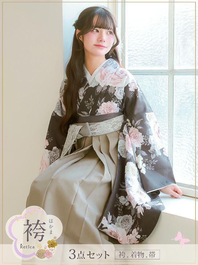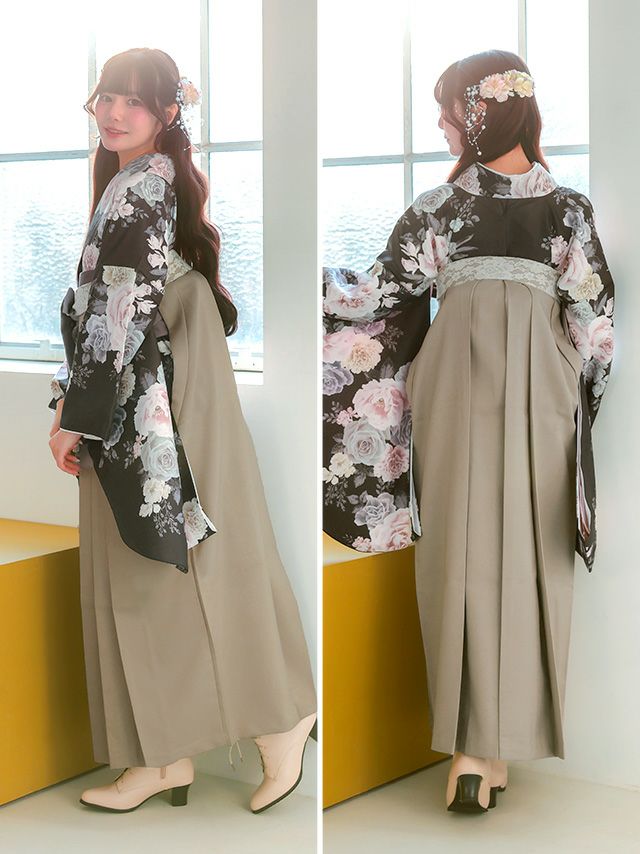 ダークブラウンの生地に豪華な薔薇柄が目を引く袴セット