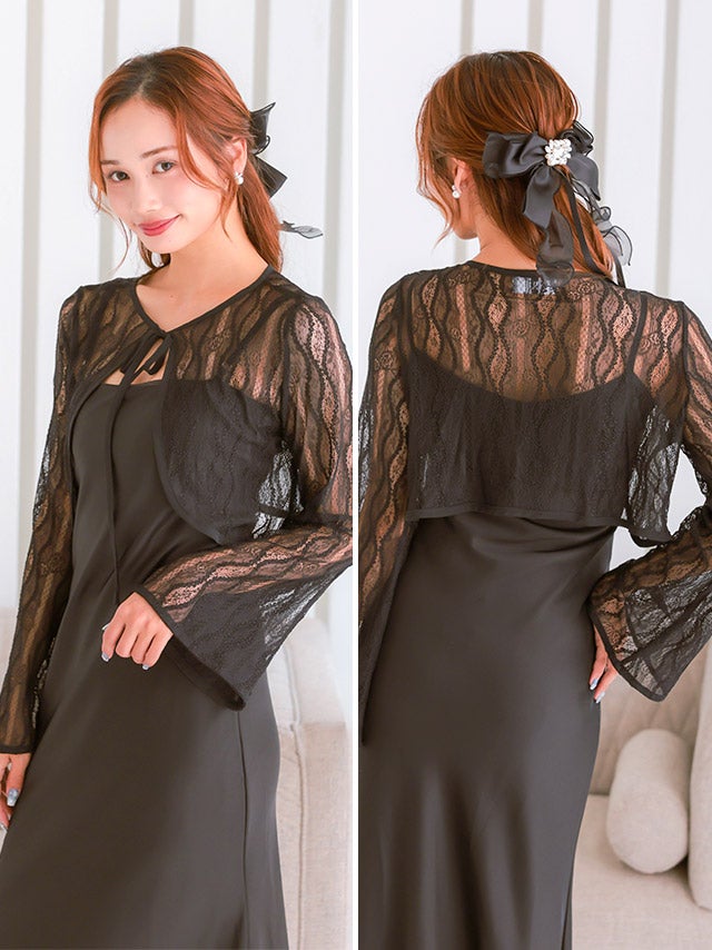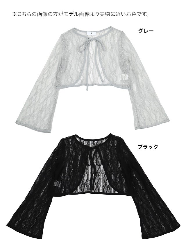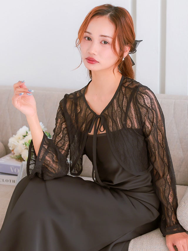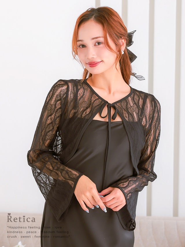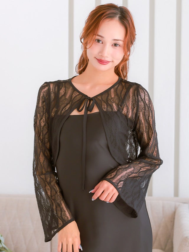 ブラックの透け感ある長袖フレアスリーブボレロ。