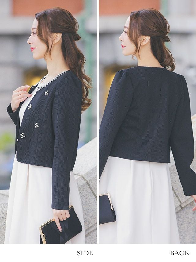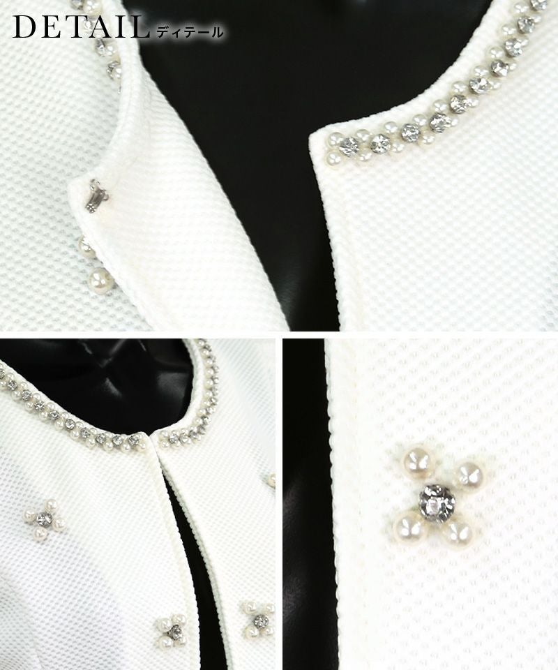 ホワイトパールデザインノーカラーボレロジャケットのメイン画像 ホワイトパールデザインノーカラーボレロジャケットのイメージ画像 ホワイトパールデザインノーカラーボレロジャケットのフロント ホワイトパールデザインノーカラーボレロジャケットのサイドバック ホワイトパールデザインノーカラーボレロジャケットのカラバリ画像 ホワイトパールデザインノーカラーボレロジャケットの商品詳細 ディテール