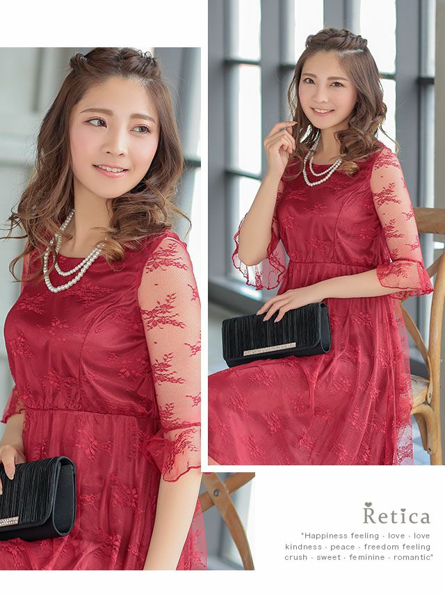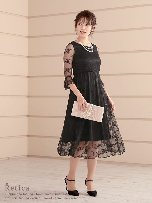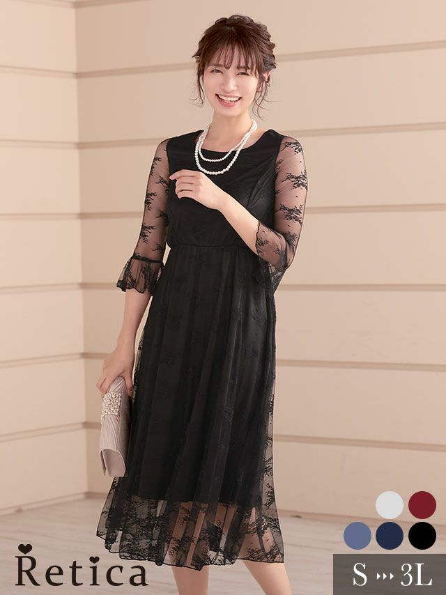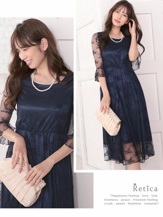 4. ワンカラー七分袖レース切り替え膝下結婚式パーティードレス [Retica/レティカ]