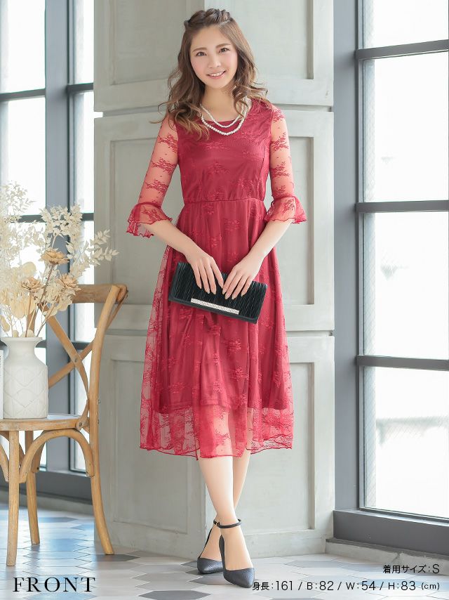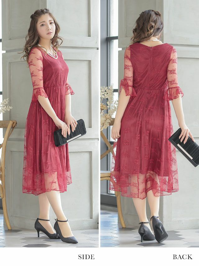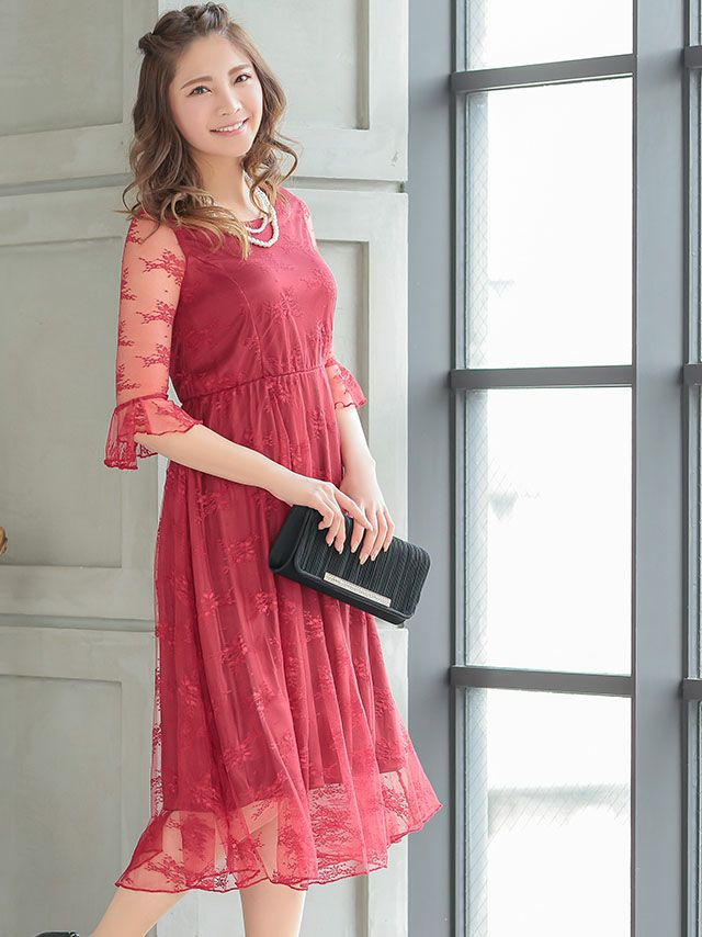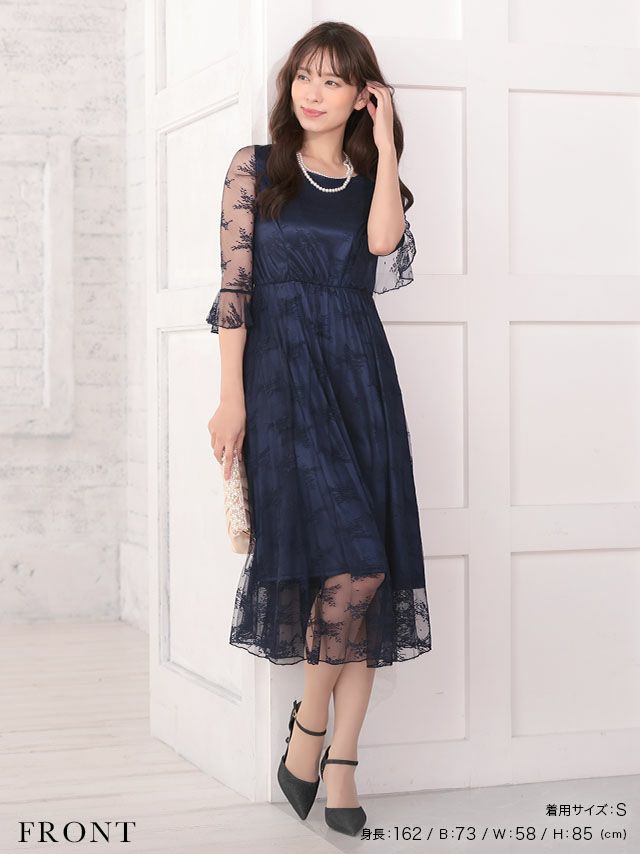 ワンカラー大人デザインレース切り替えミモレ丈ハーフスリーブ結婚式パーティードレス