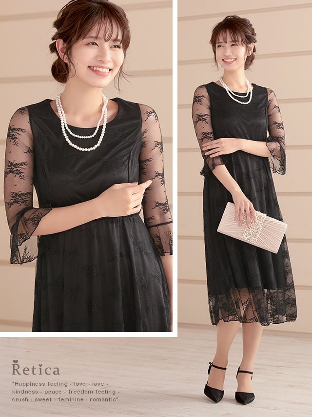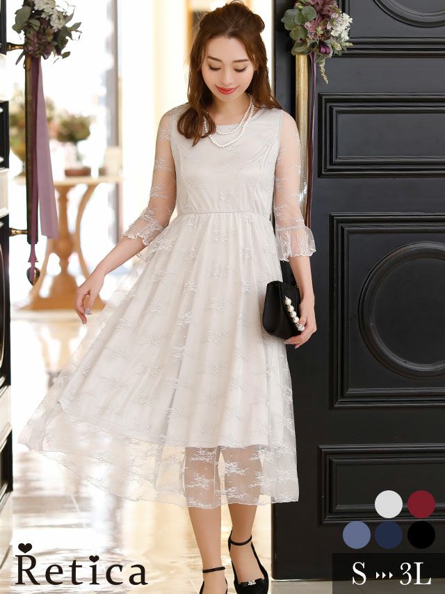 3. ワンカラー七分袖レース切り替え膝下結婚式パーティードレス [Retica/レティカ]