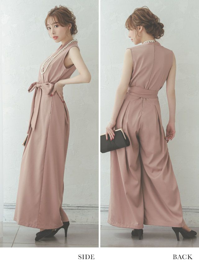 4. カシュクールネックノースリーブウエストリボンワンカラーパンツ結婚式パーティードレス [Retica/レティカ]