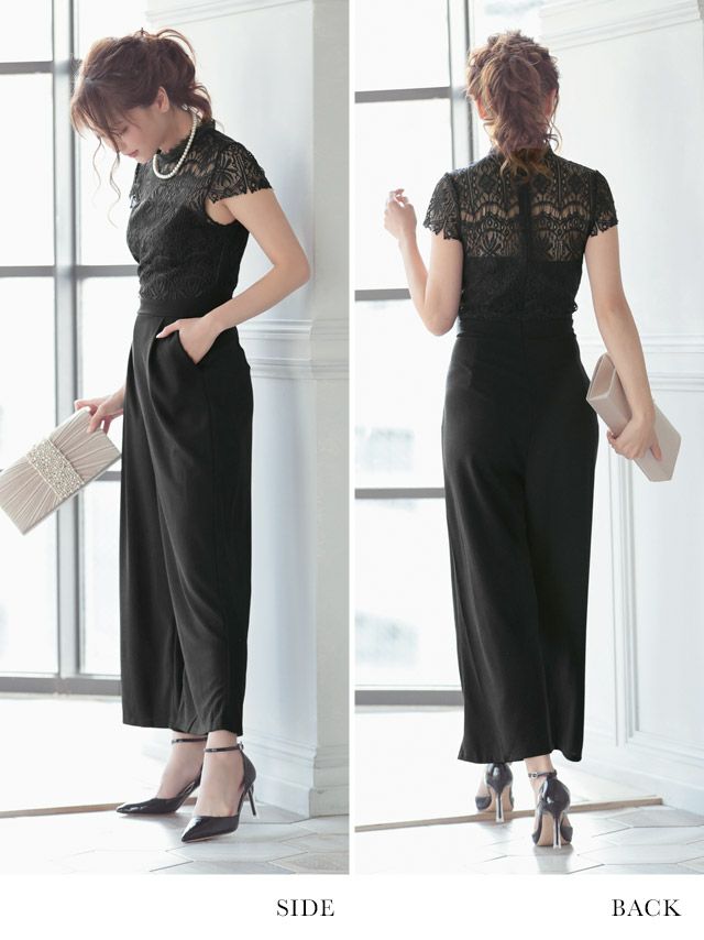フレンチスリーブ大人ハンサムレースハイウエスト結婚式パーティーパンツドレスのサイドバック画像