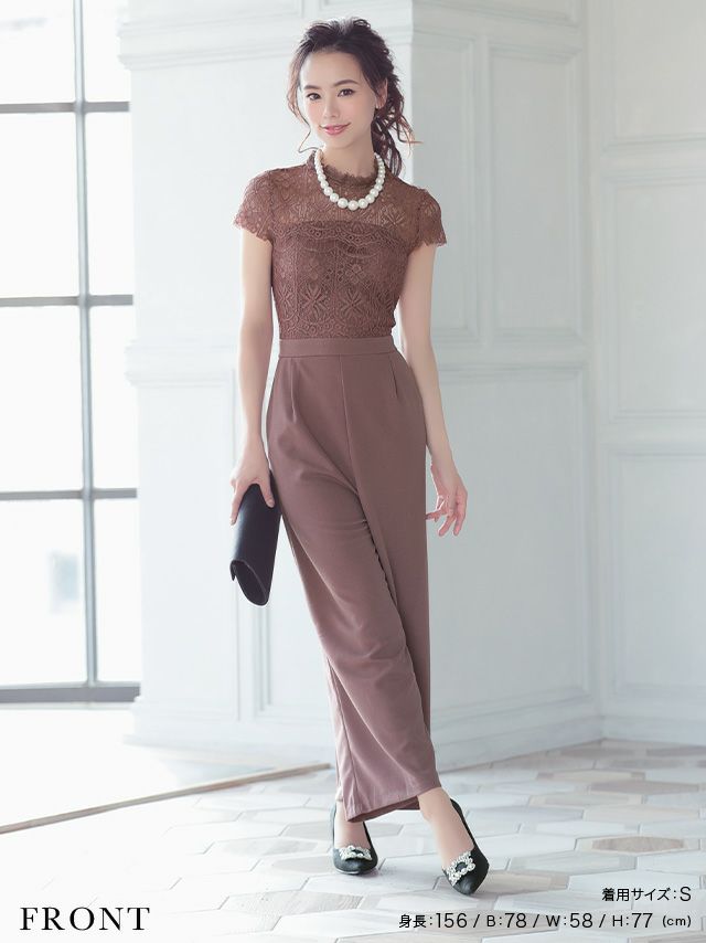 フレンチスリーブ大人ハンサムレースハイウエスト結婚式パーティーパンツドレスのフロント画像