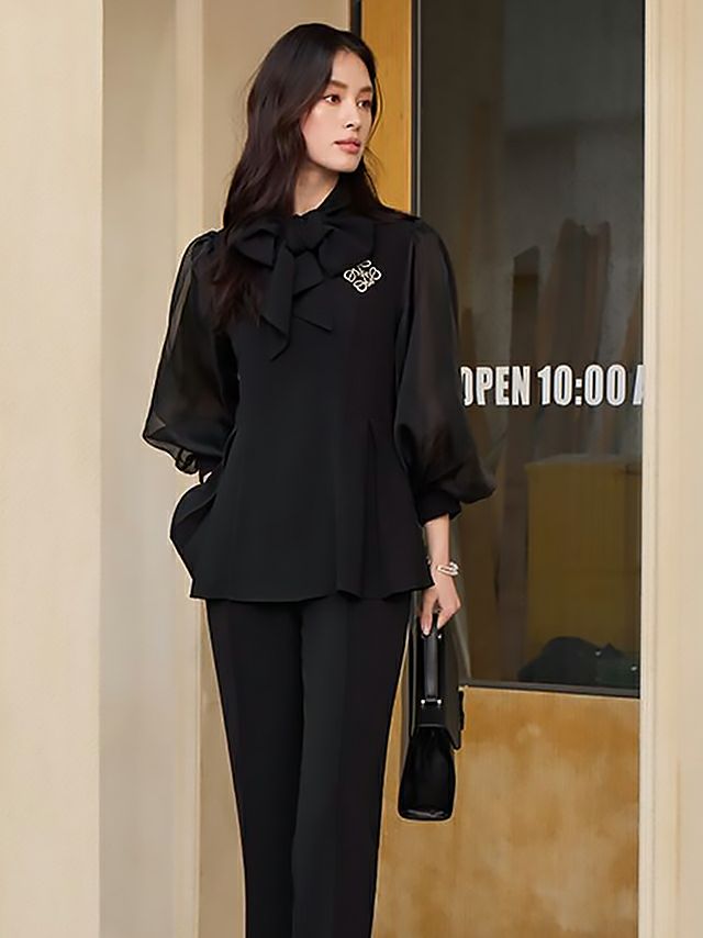 透け感のあるパフスリーブのブラウスと