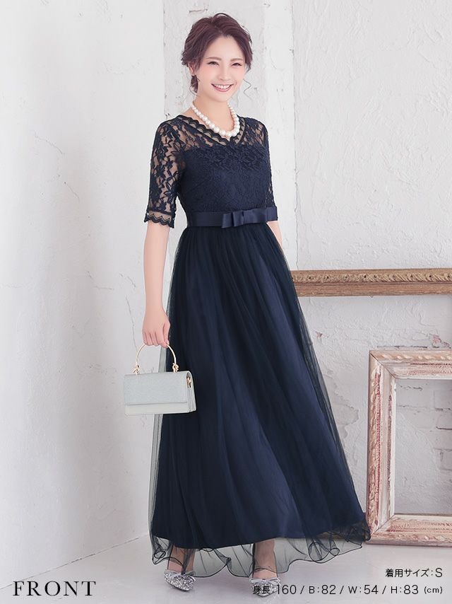 ウエストリボンチュールロングスカートレース5部袖結婚式パーティードレスのフロント画像
