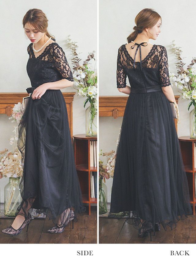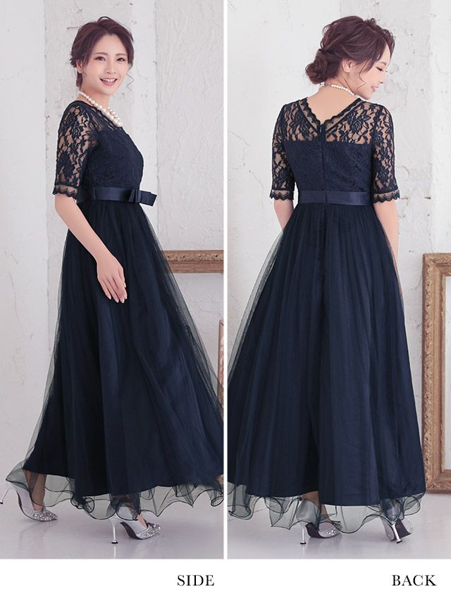 ウエストリボンチュールロングスカートレース5部袖結婚式パーティードレスのサイドバック画像