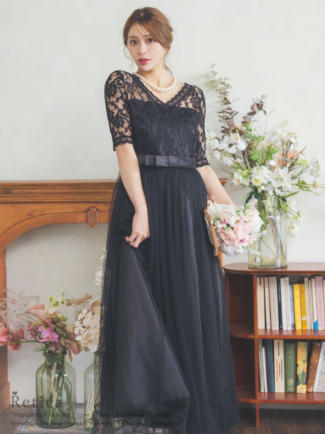 ウエストリボンチュールロングスカートレース五分袖結婚式パーティードレス [Retica/レティカ]