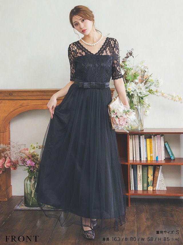 5. ウエストリボンチュールロングスカートレース五分袖結婚式パーティードレス [Retica/レティカ]