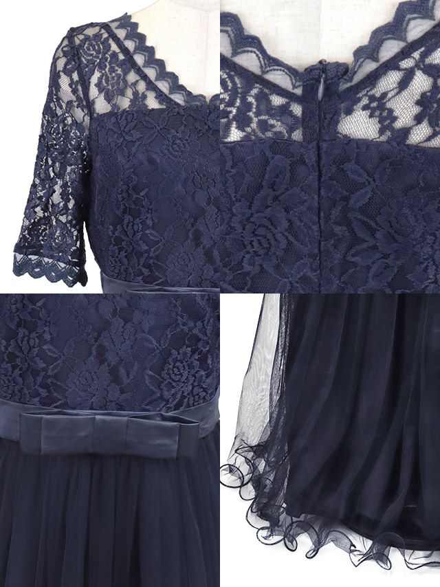 ウエストリボンチュールロングスカートレース5部袖結婚式パーティードレスの商品詳細 ディテール2