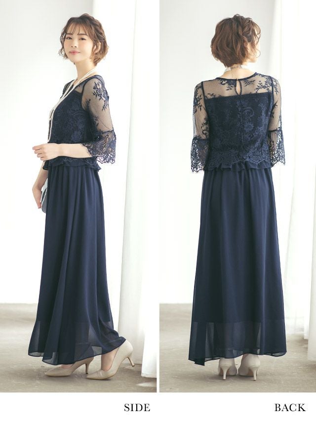 シフォンロングスカートレーススリーブ結婚式パーティードレス