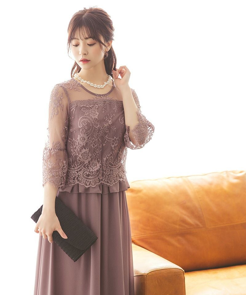 シフォンロングスカートレーススリーブ結婚式パーティードレスのイメージ画像1
