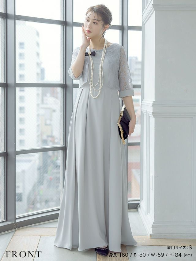 ワンカラーボレロ風デザインロングスカートレーススリーブ結婚式パーティードレス