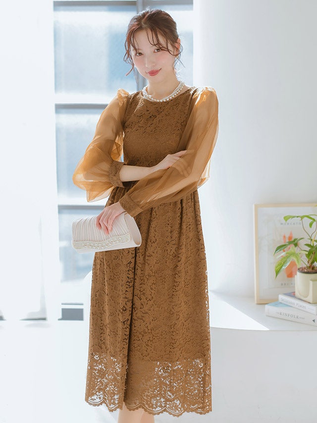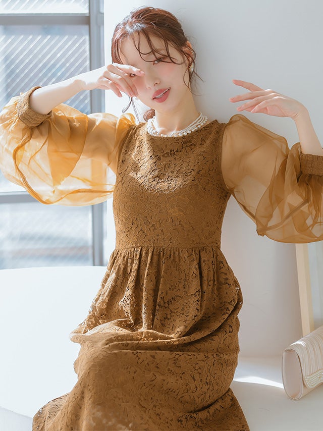 上品な総レースデザインと軽やかなシフォンスリーブが