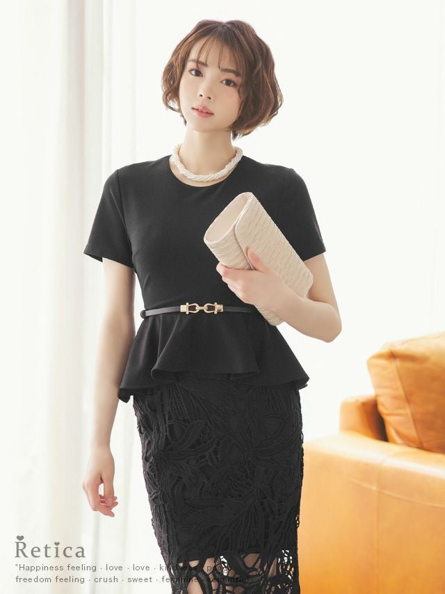 ベルト付きペプラムケミカルレースミモレ丈ショートスリーブ結婚式パーティードレス [Retica/レティカ]