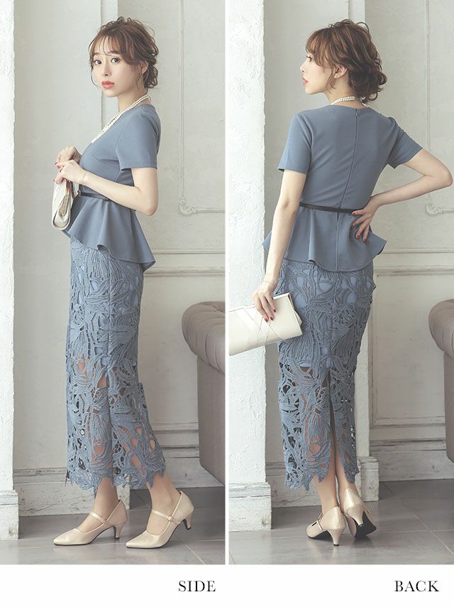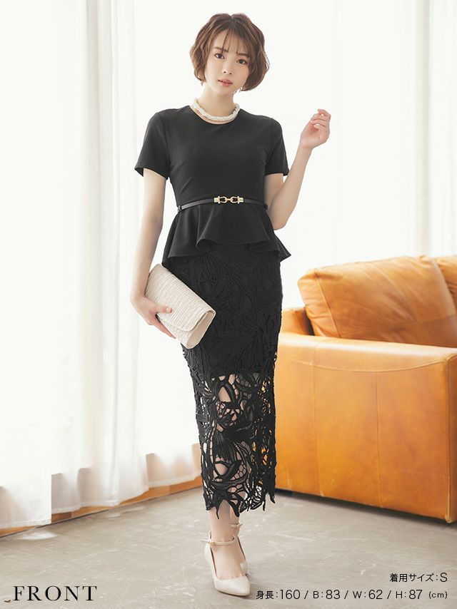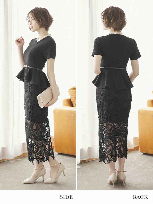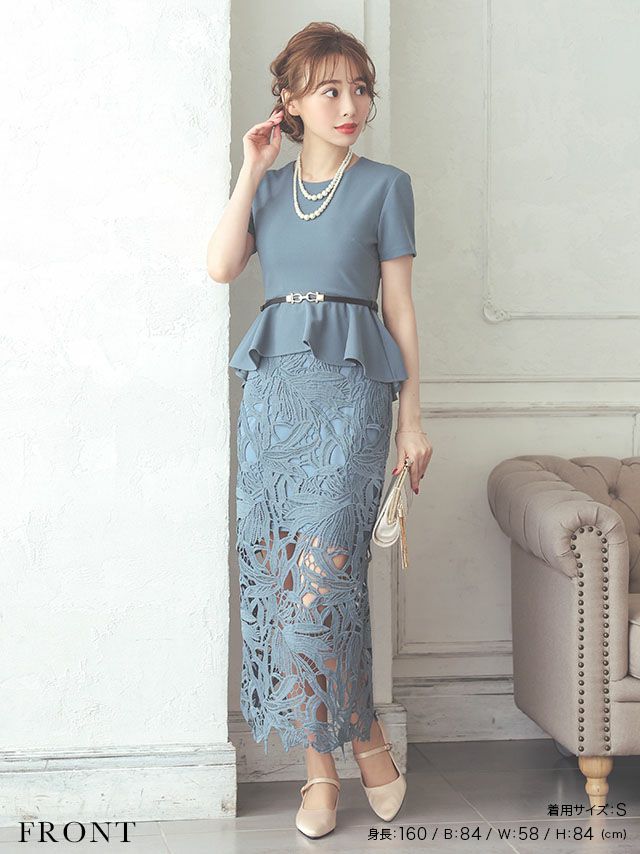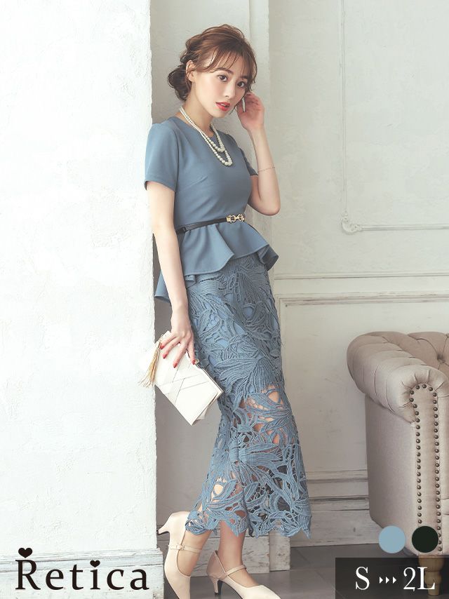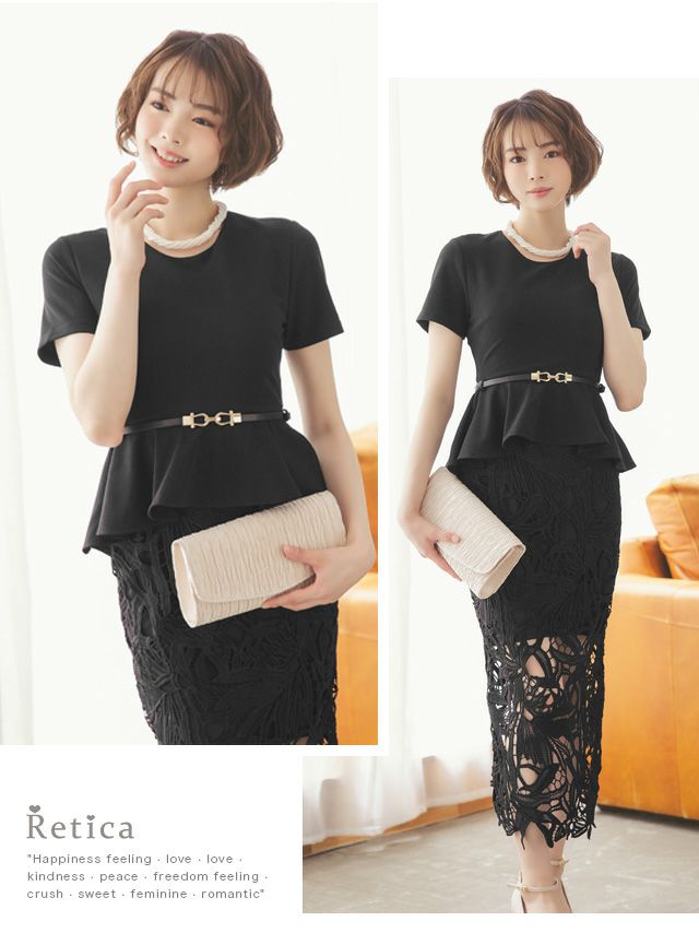 4. ベルト付きペプラムケミカルレースミモレ丈ショートスリーブ結婚式パーティードレス [Retica/レティカ]