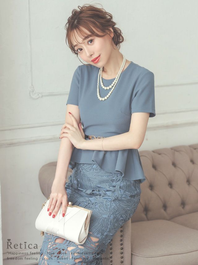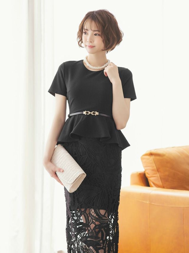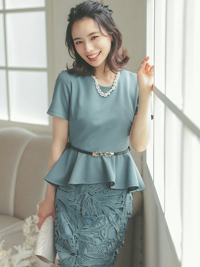 5. ベルト付きペプラムケミカルレースミモレ丈ショートスリーブ結婚式パーティードレス [Retica/レティカ]