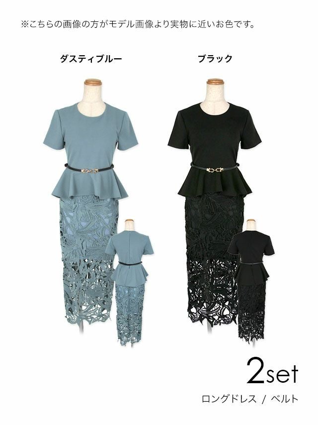 ベルト付き半袖ペプラムケミカルレースロング結婚式パーティードレスのカラーバリエーション画像
