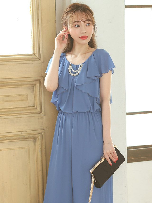 パールネックレス付き大人シフォンフリルスリーブハンサムワイド結婚式パーティーパンツドレスのフロント画像