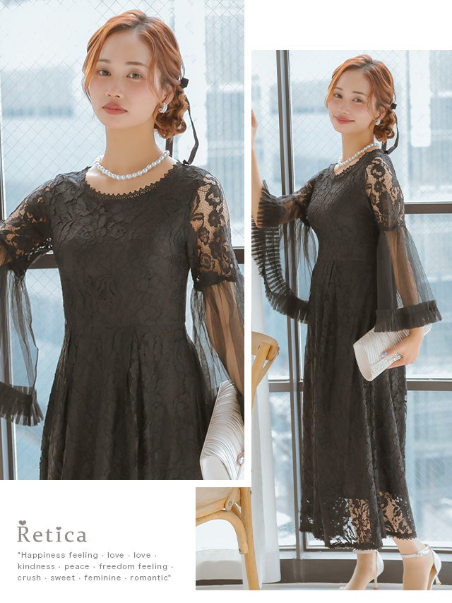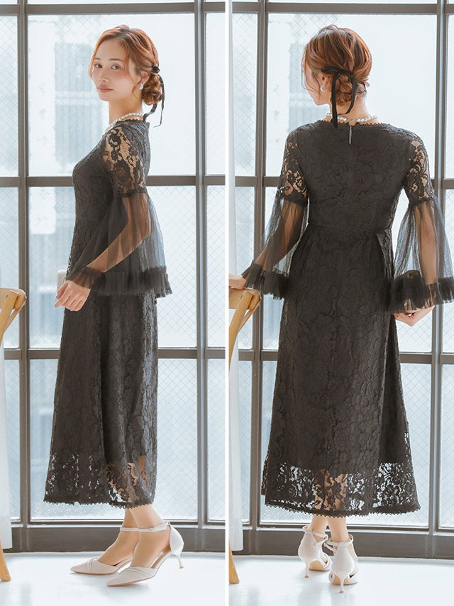 5. [SALE] 長袖透け感チュールベルスリーブフレアレースパーティードレス 結婚式 二次会(Sサイズ~3Lサイズ)