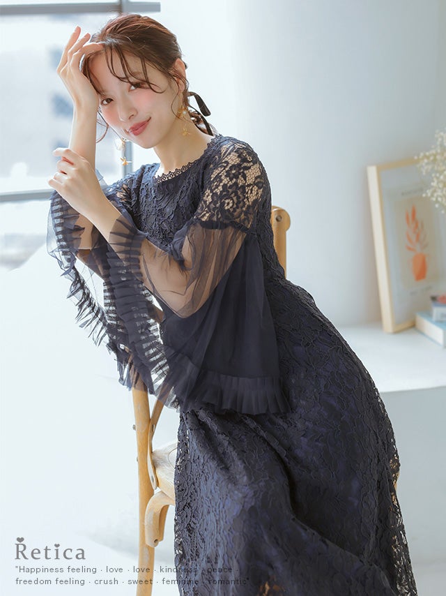 透け感レースで軽やか♪ [SALE] 長袖透け感チュールベルスリーブフレアレースパーティードレス 結婚式 二次会(Sサイズ~3Lサイズ)