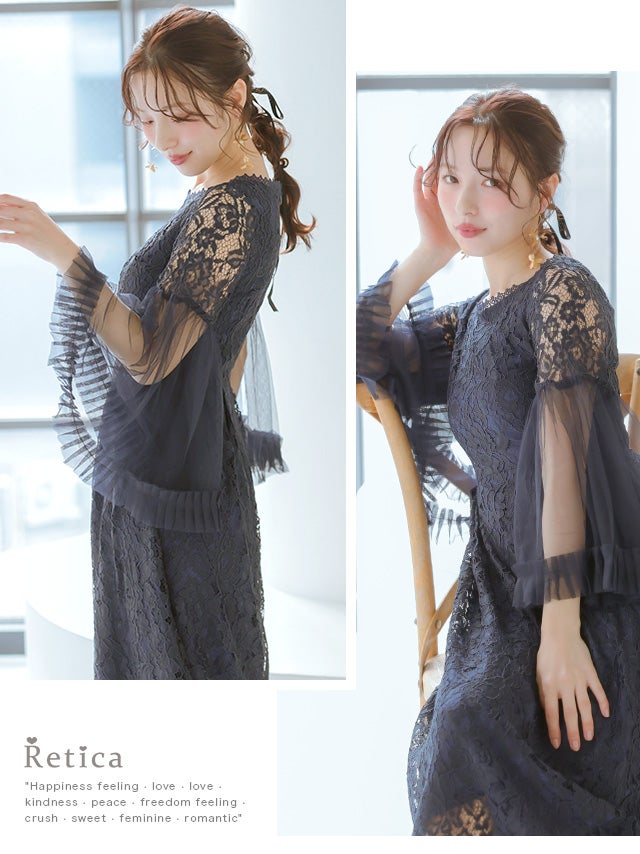 4. [SALE] 長袖透け感チュールベルスリーブフレアレースパーティードレス 結婚式 二次会(Sサイズ~3Lサイズ)