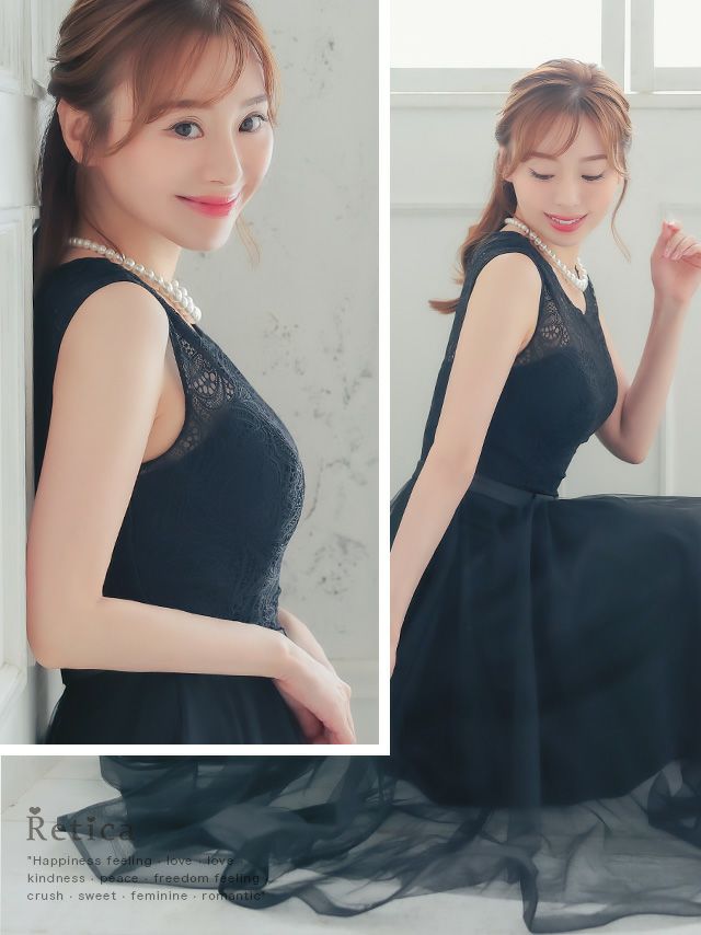 刺繍レースウエストリボン切替チュールシフォン膝下結婚式パーティードレス [Retica/レティカ]