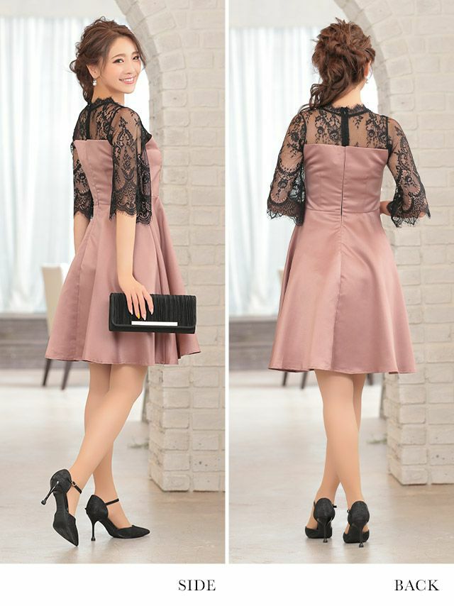 ブラックレース切り替えサテン素材フレアミニ丈ハーフスリーブ結婚式パーティードレスのサイドバック画像