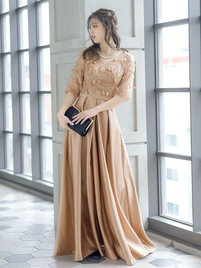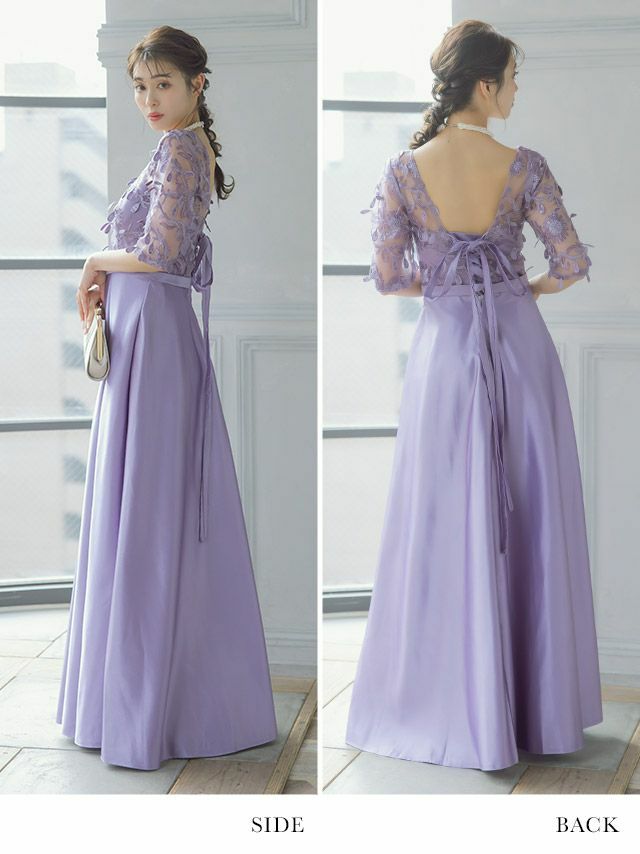 - [SALE] シアー3Dフラワー五分袖バックレースアップウエスト切替サテンロングスカート結婚式パーティードレス [Retica/レティカ]