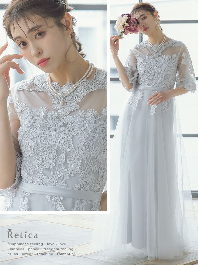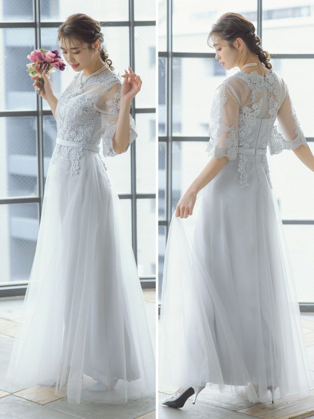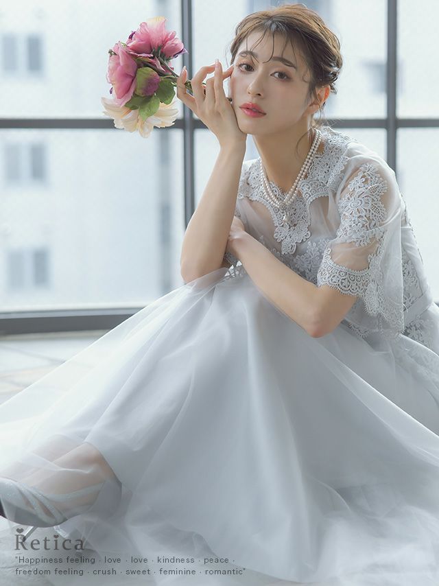 "きちんと感"が大事な二次会。露出感を抑える袖ありのワンピースが主流ですが、レースやシフォン素材で、控えめな華やぎを持たせるのがポイント。