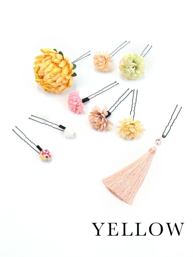 5. くすみカラー菊×和玉タッセルヘアアクセサリー9点セット袴・振袖・浴衣対応(イエロー/レッド/ブルー)