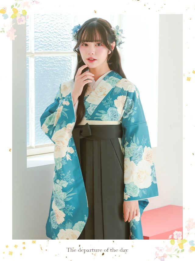 鮮やかな青緑生地に大きめのバラ柄が映える袴セット