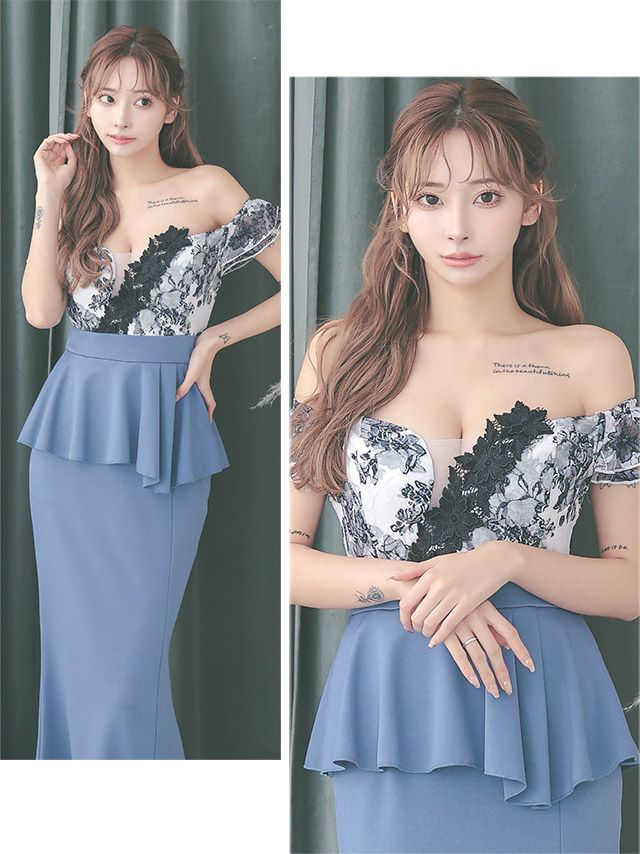 4. 2Wayオフショルダーフェミニンレース刺繍アシメぺプラム切り替えバックタイトロングドレス (Sサイズ~XXLサイズ) (天乃えま/キャバドレス着用)