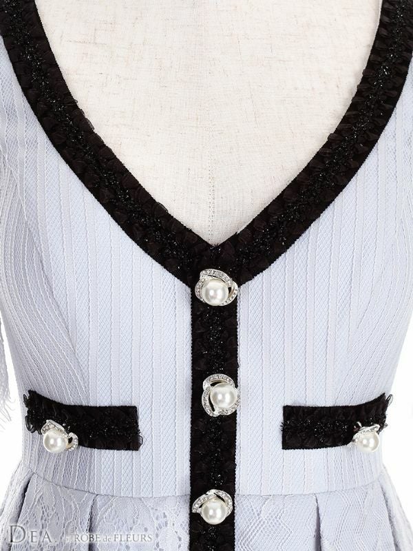 DEA.byROBEdeFLEURS ディアバイローブドフルール 高級スーツ風デザインパイピングパールボタンペプラム袖ありタイトミニドレス