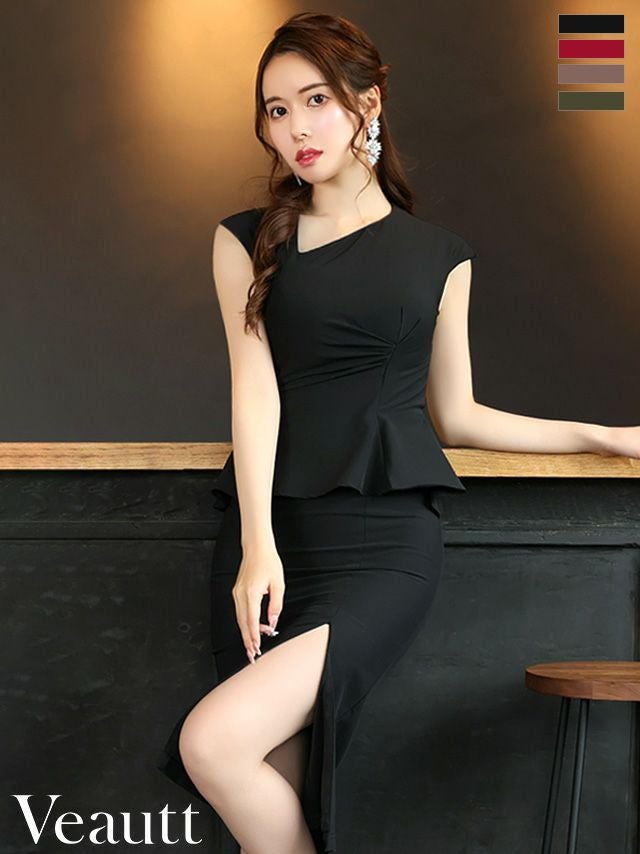 キャバドレス ミニドレス [Veautt/ヴュート] 高級クロスギャザーペプラムスリットノースリーブタイト膝丈ドレス