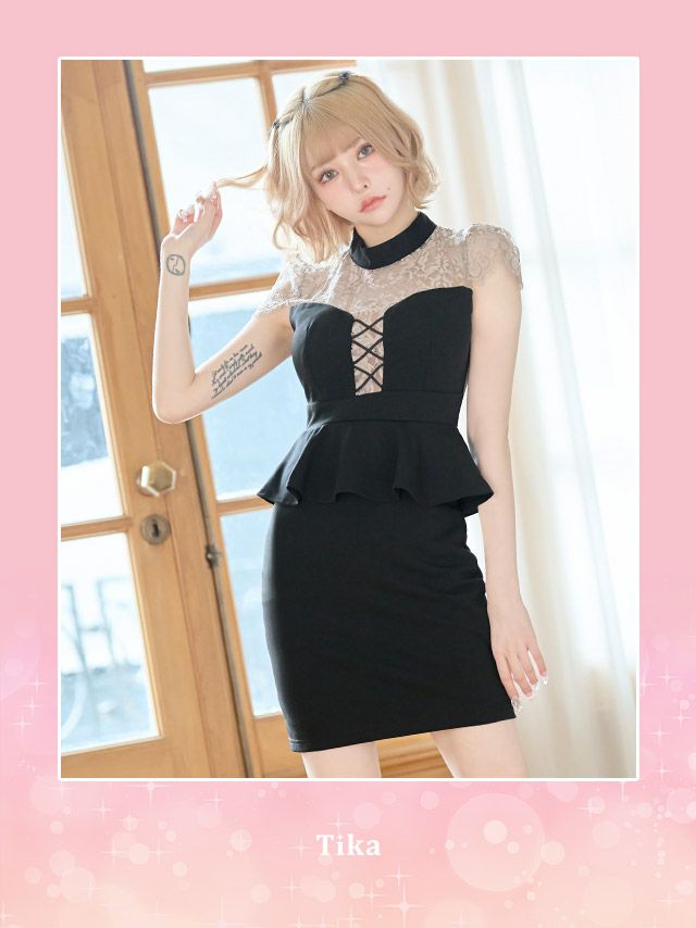 キャバドレス ミニ丈 大きいサイズ 袖あり キャバクラ Tika ティカ ハイネック半袖レース切り替えバストクロスペプラムストレッチタイトミニドレス