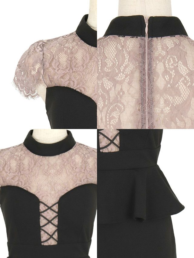 ハイネック半袖レース切り替えバストクロスペプラムストレッチタイトミニドレスの商品詳細1