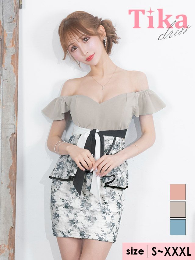 キャバドレス ミニ丈 大きいサイズ 体型カバー キャバクラ Tika ティカ オフショルダーフリルバイカラーウエストリボンペプラム切り替えフラワーレースタイトミニドレス